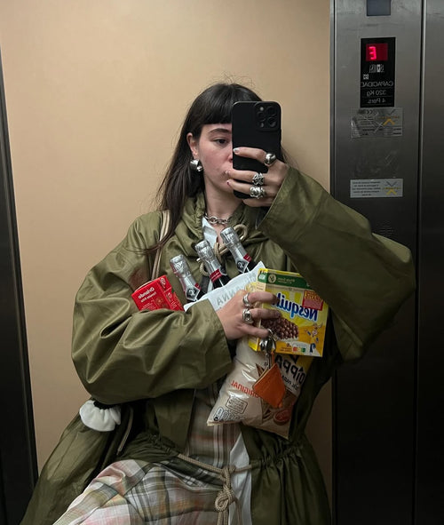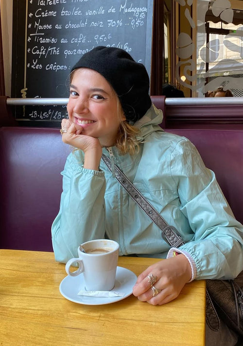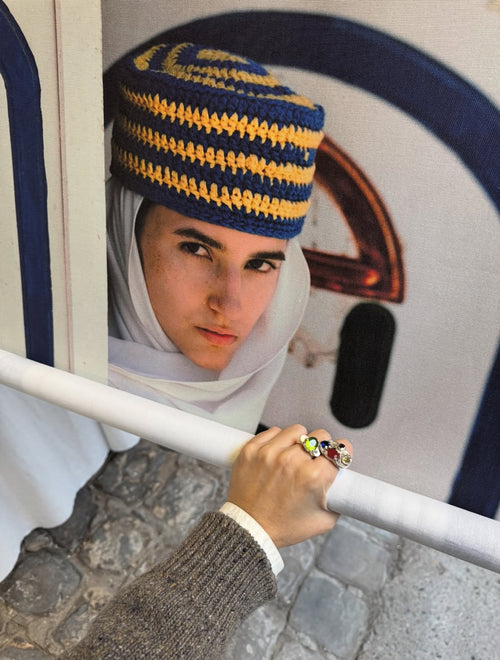 Minerales como ojo de buey, labradorita, turmalinas, obsidiana o fluorita conviven con conchas recogidas en playas mediterráneas y beads vintage encontrados con paciencia. Plata trabajada a mano y piedras engastadas se unen sobre hilo encerado para crear piezas que no se repiten.
