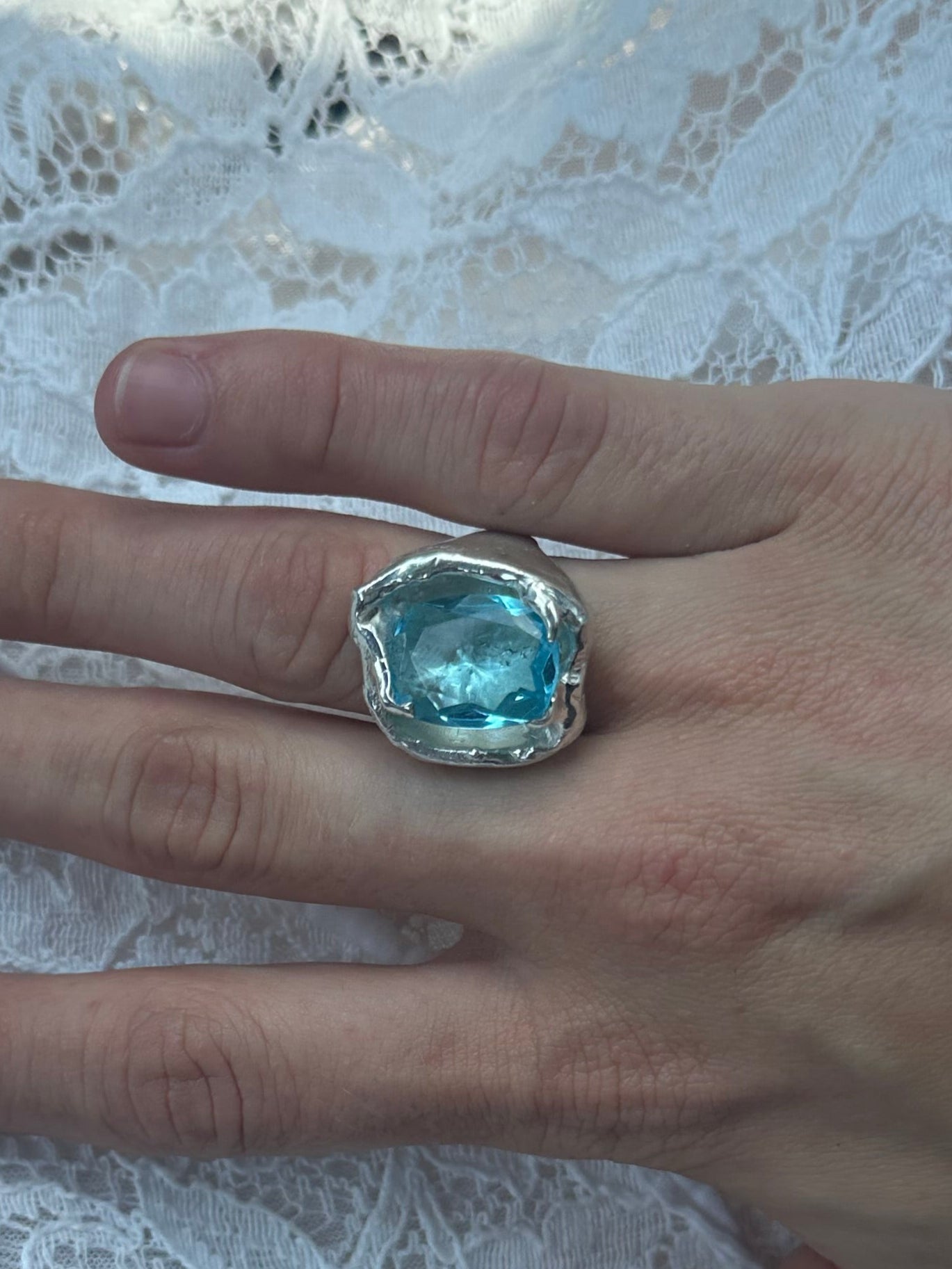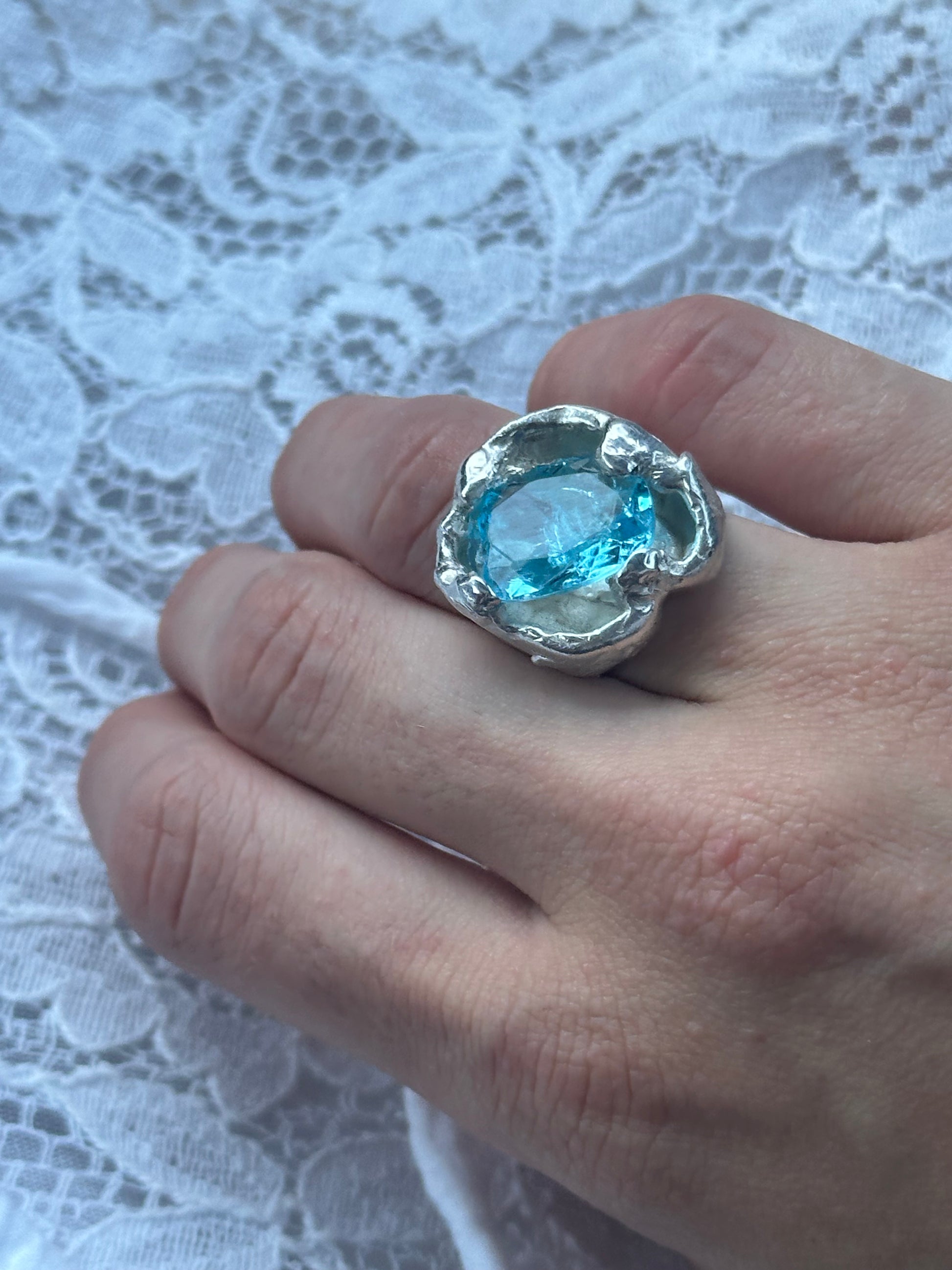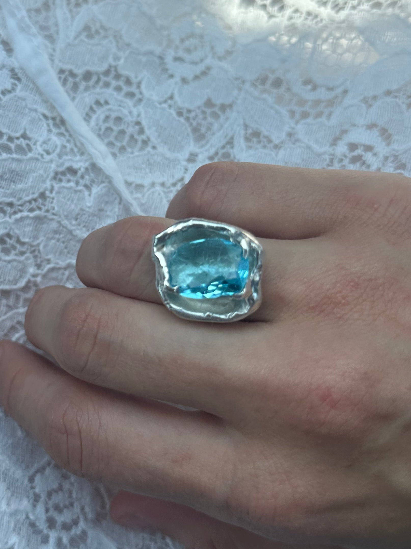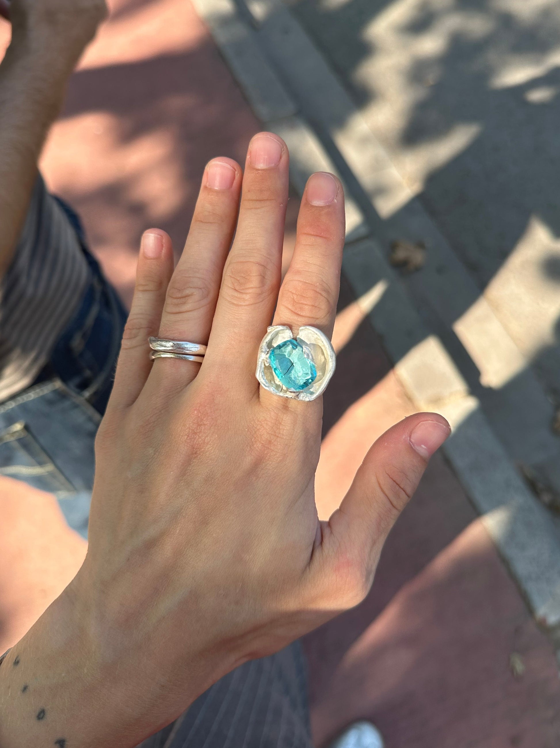 La piscina, anillos hechos uno a uno con cristal azul, todos son diferentes.
